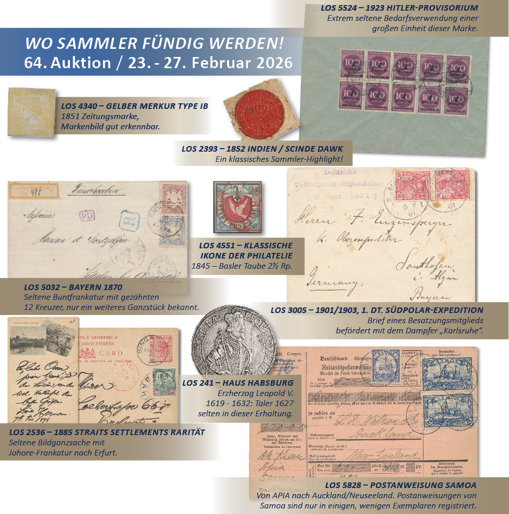 Bei der 64. Auktion des Auktionshauses Gärtner im Februar 2026 erwartet Sammler ein außergewöhnliches Angebot: Herausragende postalische und philatelistische Belege der großen Polarexpeditionen von 1899 bis 1935, eine preisgekrönte Sammlung zum Warschauer Aufstand 1944 und seiner Pfadfinderpost, eine Spezialsammlung mit Abarten des frühen Nordvietnam sowie eine umfangreiche Schweiz-Flugpost-Sammlung.