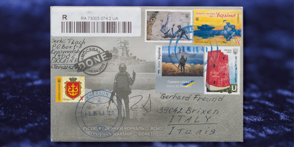 Dieses außergewöhnliche Los umfasst einen eingeschriebenen Brief aus der südukrainischen Stadt Cherson, verschickt am 23. Juni 2025 nach Italien, wo er am 15. Juli 2025 ankam. Der Brief ist mit mehreren symbolträchtigen Marken frankiert – darunter die erste Ausgabe der berühmten „Russisches Kriegsschiff – F* off“-Briefmarke**, die Banksy-Marke, die „Traktor zieht Panzer“-Ausgabe sowie die Cherson-Briefmarke mit der Wassermelone, einem Symbol der Befreiung der Region.